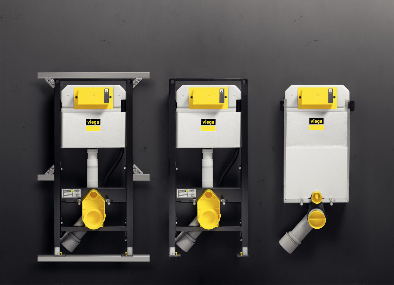 In alle Viega Prevista-elementen worden dezelfde inbouwreservoirs toegepast. De spoeltechniek is altijd gelijk - onafhankelijk van bouwhoogte en -diepte. Dat vereenvoudigt niet alleen de montage op locatie maar biedt tot aan de uiteindelijke afwerking ook de vrijheid om een bedieningsplaat naar keuze te selecteren.